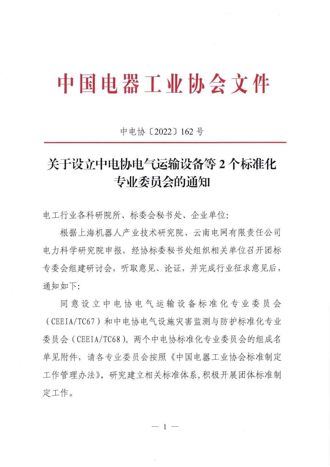 2022年10月20日,中电协[2022]162号文件下达了《关于设立中电协电气运输设备等2个标准化专业委员会的通知》,同意设立中电协电气运输设备标准化专业委员会(CEEIA/ TC67),秘书处挂靠单位为jiuyou.com九游(中国)机器人有限公司官网。